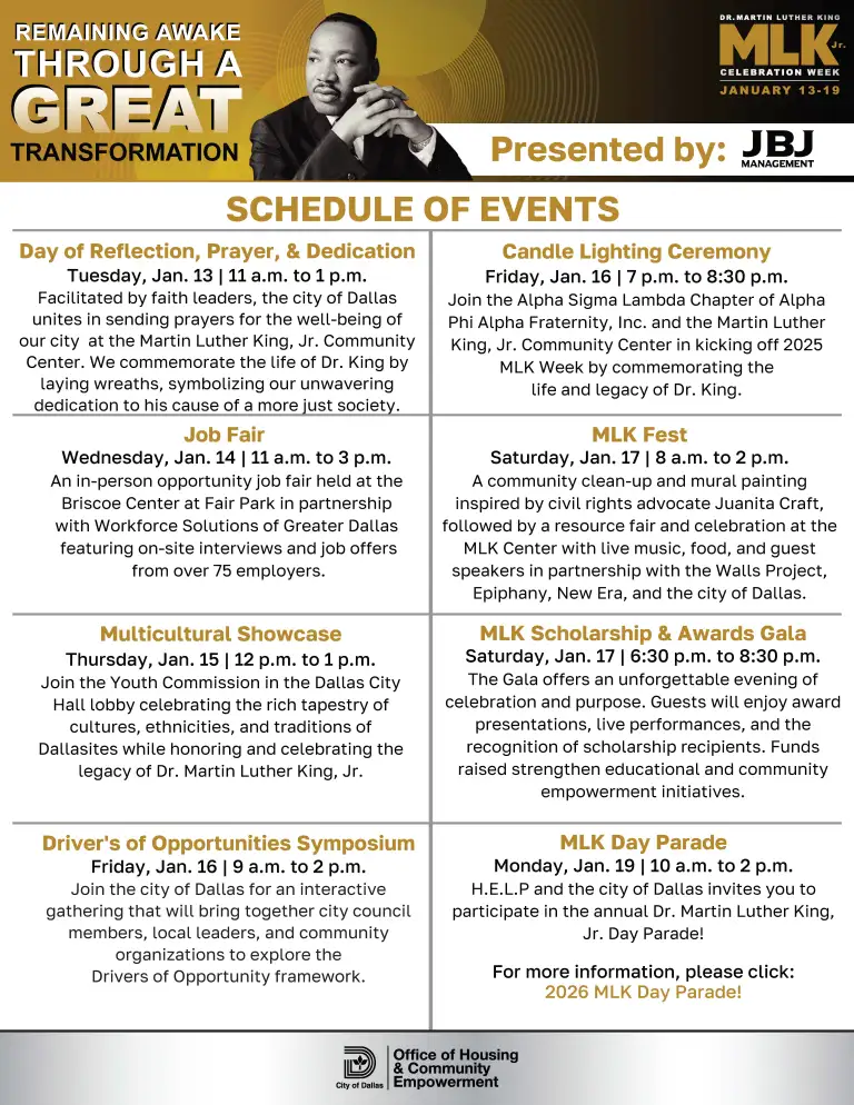 Details: The 2026 MLKCC Grand Parade & Festival will be celebrated on Monday, January 19, 2026. Learn more