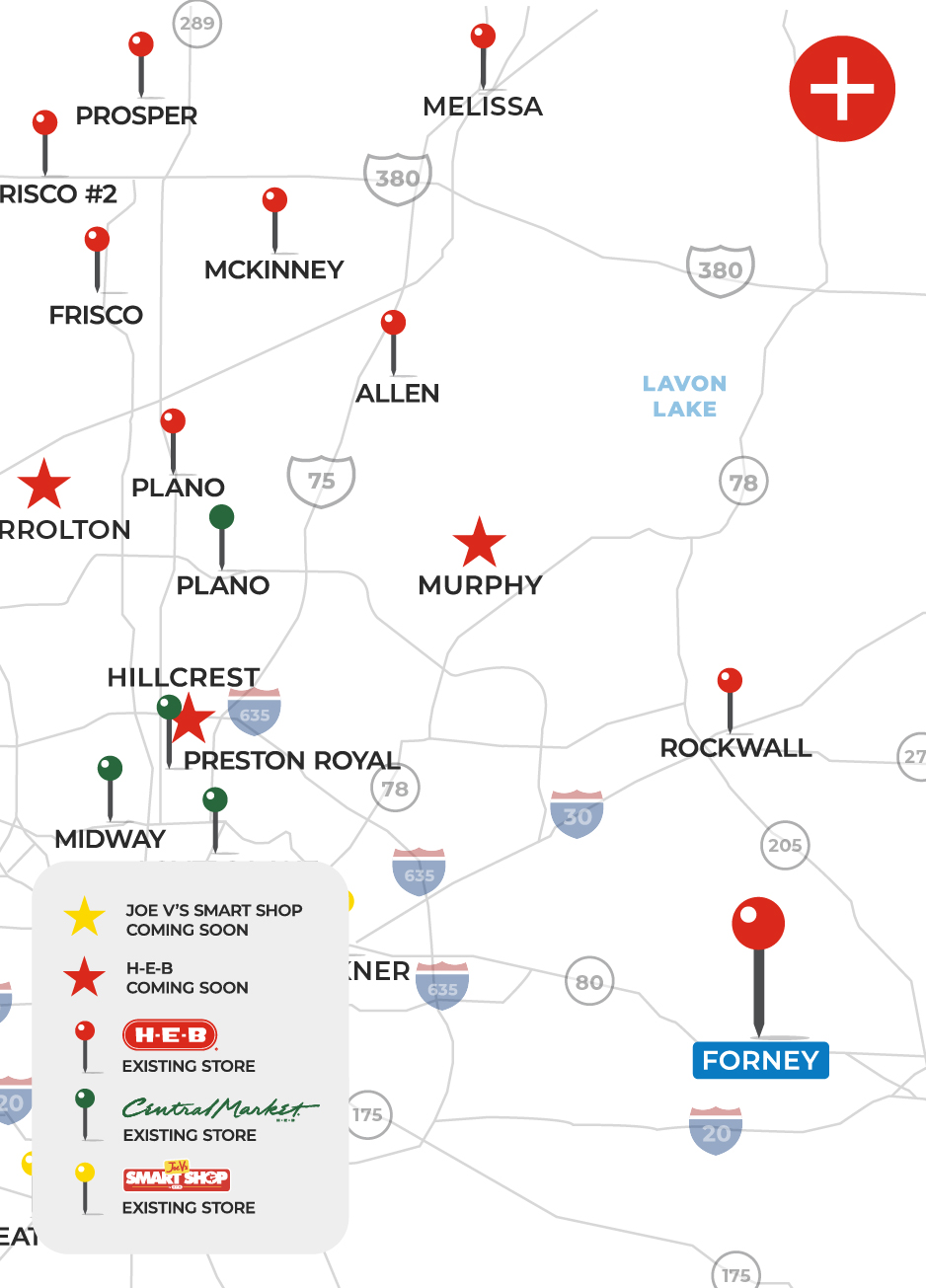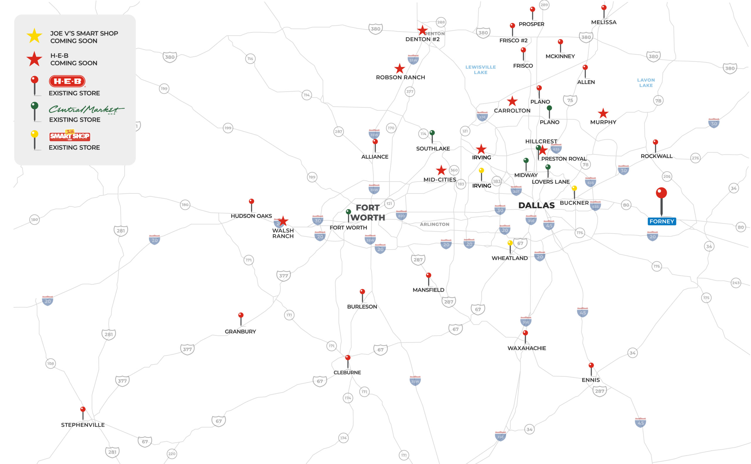 In the DFW area, H-E-B has opened H-E-B stores in Plano, McKinney, Allen, Alliance, Mansfield, Melissa, Prosper, Rockwall, and two stores in Frisco. Additionally, H-E-B has officially announced plans for stores in Irving, Murphy, Mid-Cities, Walsh Ranch, Hillcrest, Carrollton, and Denton. Last year, the retailer also purchased land in Dallas at Hillcrest Road and LBJ Freeway, a site being considered for the company’s first H-E-B store in the city of Dallas. The retailer also has opened three Joe V’s Smart Shop stores in the DFW area, which include two in Dallas and one store in Irving.