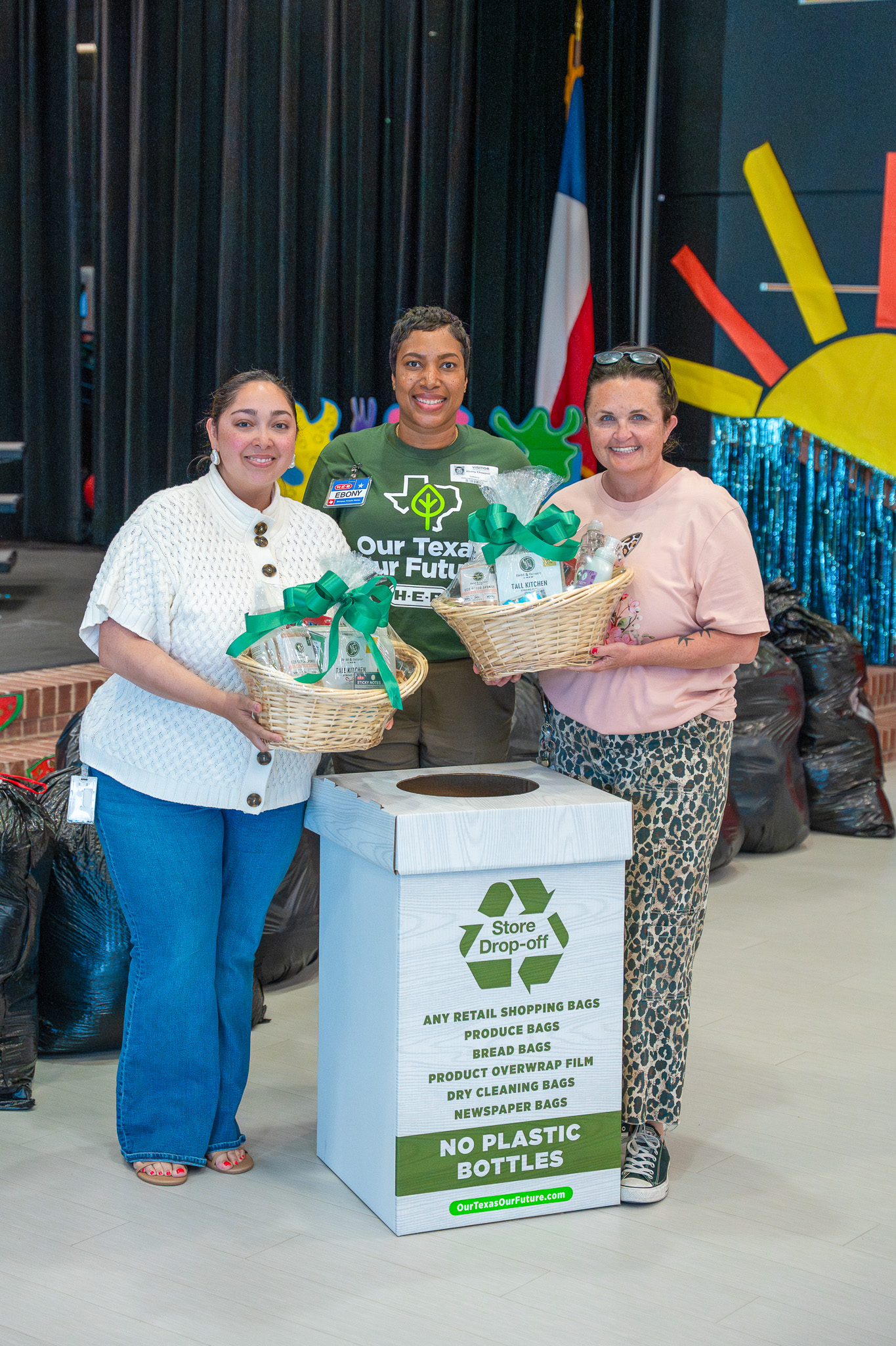 Every H-E-B store also has collection bins at the front entrance for customers to recycle plastic bags and other eligible plastic items, such as other retail shopping bags, produce bags, bread bags, dry cleaning bags, newspaper bags, and plastic overwrap for items like paper towels. Curbside customers can bring eligible plastic items to be recycled when they pick up their orders as well.
